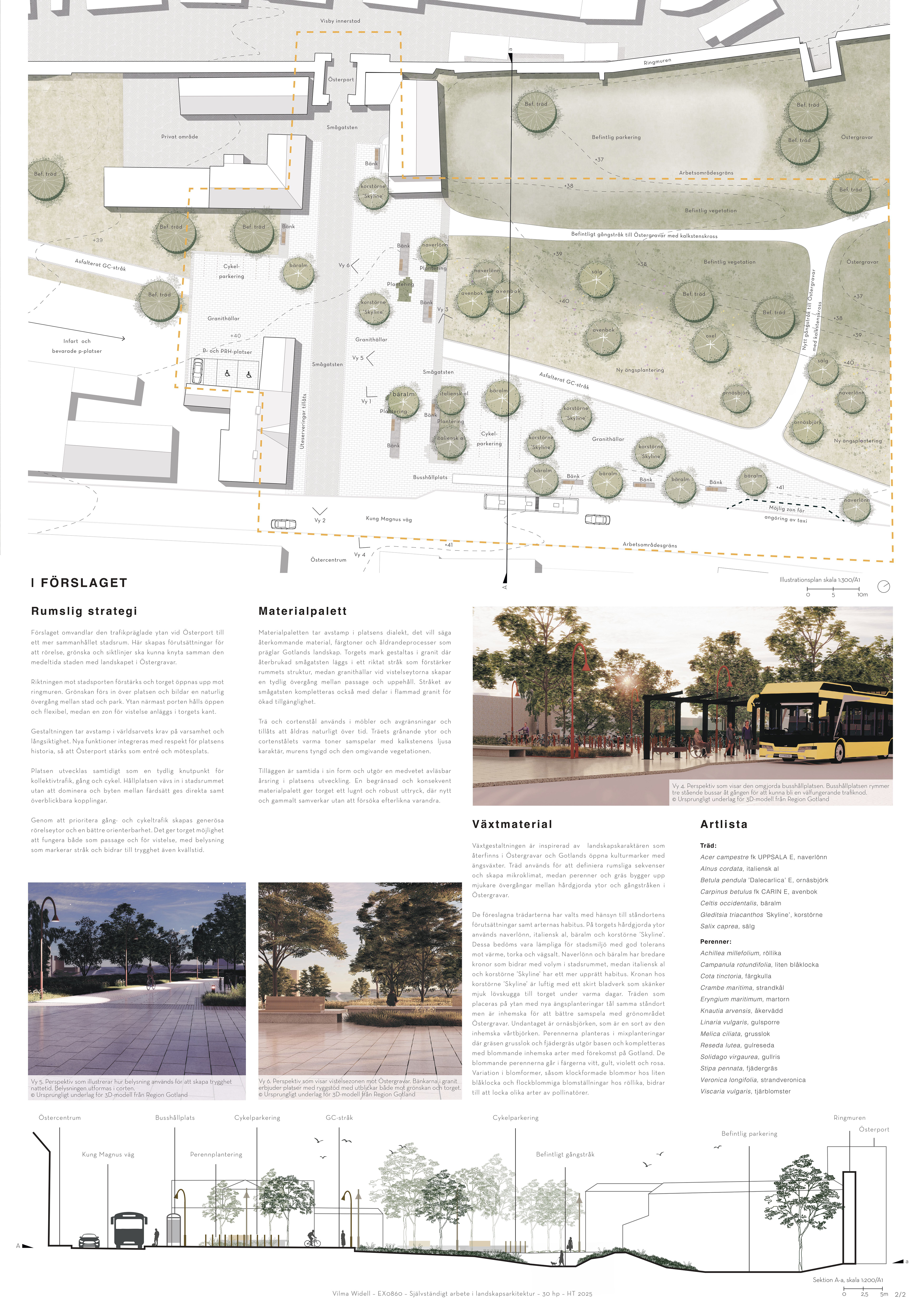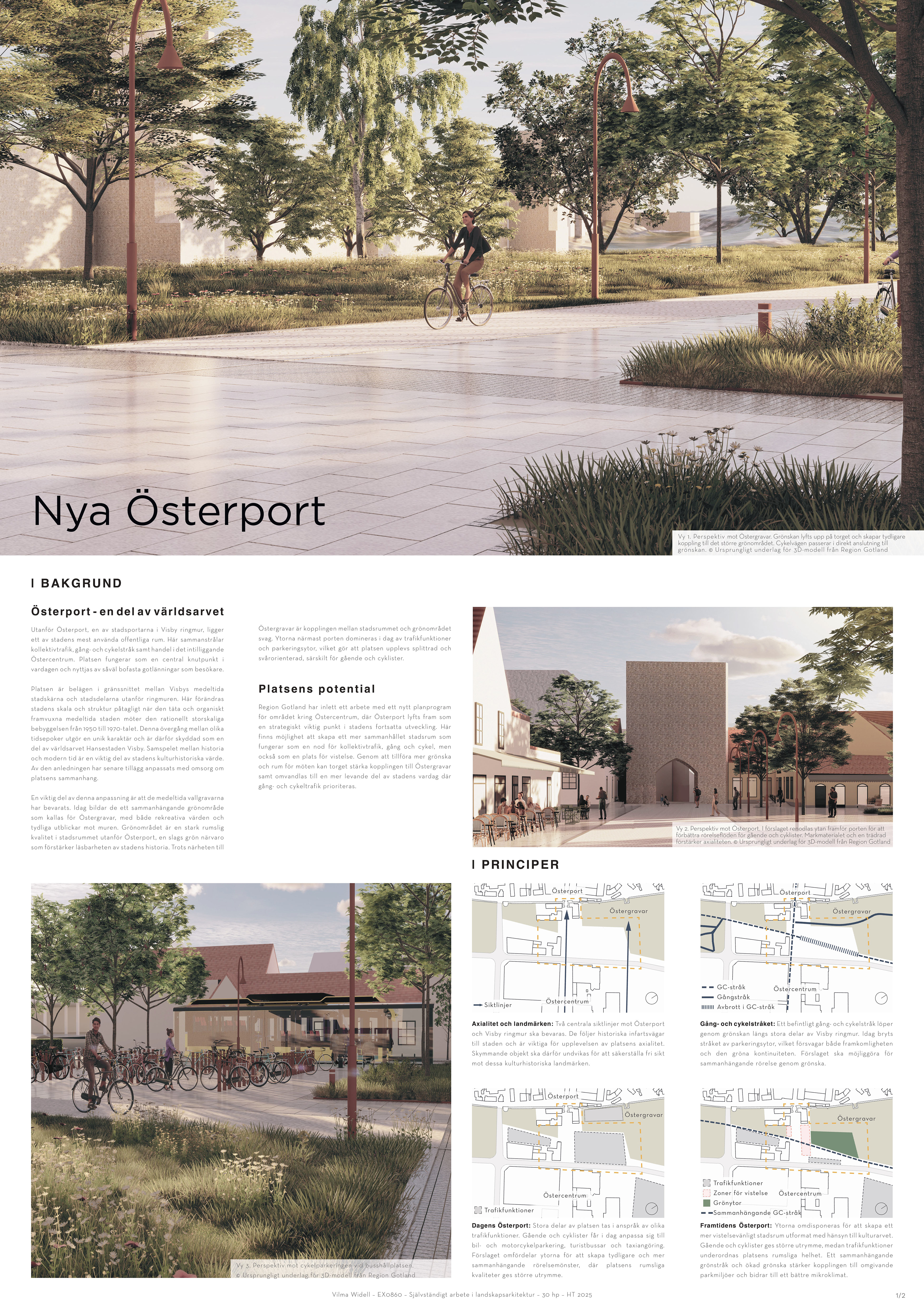 Projektet är en del av mitt examensarbete och föreslår en omgestaltning av ytan mellan Österport och Östercentrum. Syftet är att förbättra möjligheten för oskyddade trafikanter att röra sig genom området, vistas där och ta del av platsens historiska lager. Genom att omprioritera trafikens roll i stadsrummet frigörs utrymme för gång- och cykelstråk samt vistelsemiljöer i anslutning till grönytor. För att ta tillvara platsens historiska värden utvecklas nya tillägg i dialog med dess karaktär och historiska sammanhang.